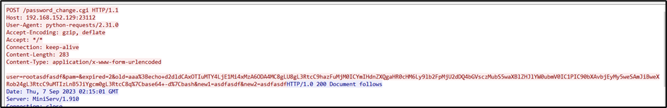 Follow TCP Stream 기능을 이용해 패킷의 내용을 살펴보았고, 그 중 성공되었다고 생각되는 패킷을 발견하였다. ‘/password_change.cgi’에서 old 파라미터가 base64로 인코딩 된 것을 발견하였다.