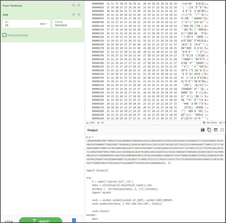 악성 코드 분석 결과 secret.txt 파일을 RSA 암호화한 후 192.168.152.130:51421로 UDP 통신을 통해 secret.txt 파일을 유출한다. 이 또한 패킷에서 획득 가능하다.