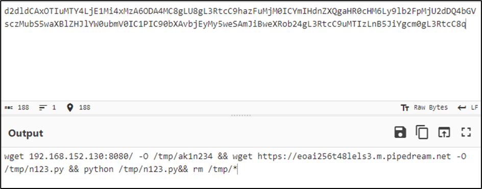 해당 base64 디코딩 결과 192.168.152.130:8080과 eoai256t48lels3.m.pipedream.net에 파일과 파이썬 파일을 다운받은 뒤 실행시키는 명령어를 확인했다.
