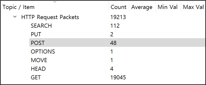 HTTP packet counter을 통해 http request 패킷의 통계를 살펴본 결과 POST 과 GET 형식의 패킷에 눈에 띄었고, POST가 GET에 비해 개수가 적고 공격 가능성이 높아 보였기 때문에 POST 패킷을 필터링해 살펴보았다.